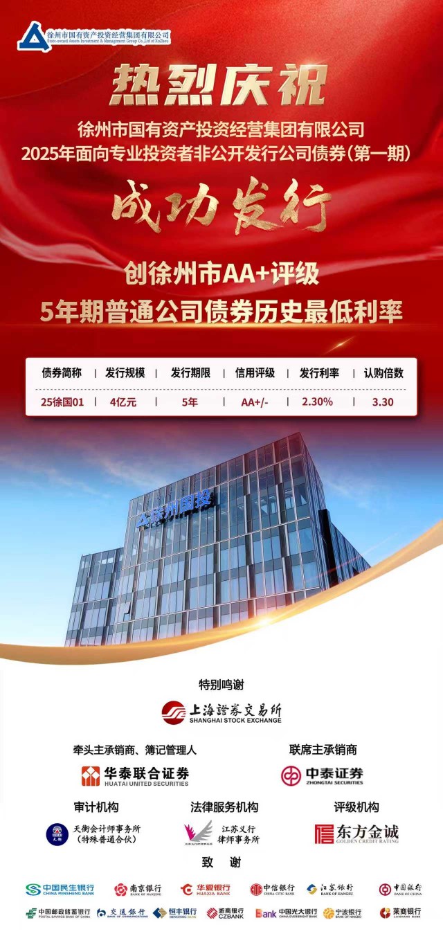 2025年10月31日,徐州國投集團(tuán)成功發(fā)行面向?qū)I(yè)投資者非公開發(fā)行公司債券(第一期),發(fā)行利率2.30%,創(chuàng)下徐州市AA+評(píng)級(jí)5年期普通公司債券歷史最低發(fā)行利率紀(jì)錄。